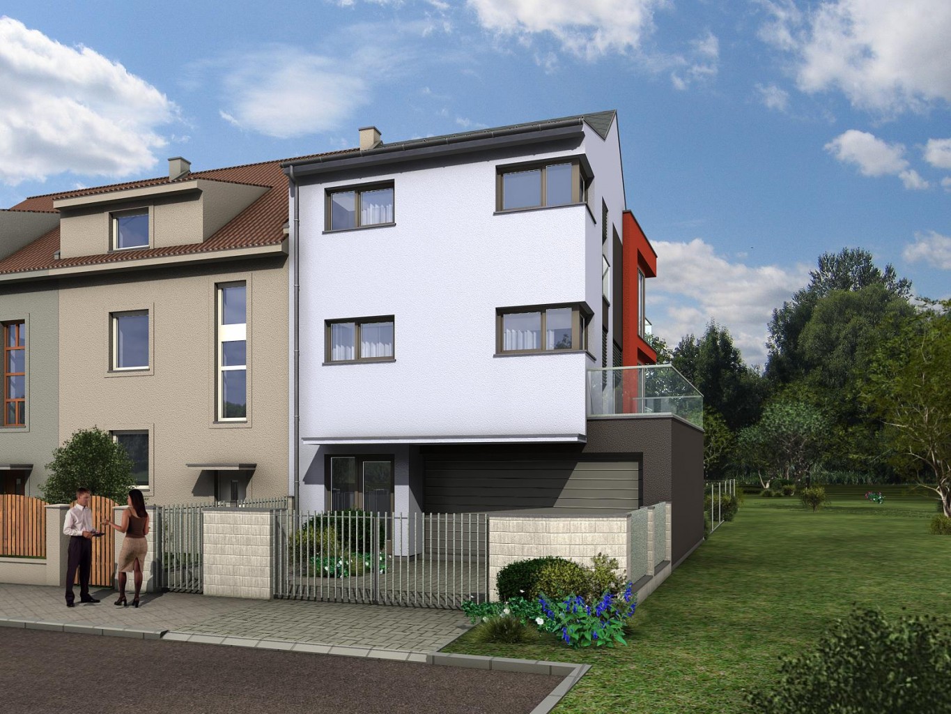 Jedná se o novostavbu objektu koncového řadového rodinného domu, se sedlovou střechou. Uliční fasádu třetího patra představuje průběžný falešný vikýř. Pro řešení parkování na pozemku investora byla zvolena garáž pro dva osobní automobily, v přízemí RD. V důsledku omezující šíře stavební parcely je garáž, a tím i celé přízemí objektu navrženo až na hranu sousedního pozemku. Horní dvě podlaží jsou již řešena zhruba v šíři sousedních řadových rodinných domů. Jihozápadní roh objektu ve druhém a třetím podlaží tvoří výrazný prvek „arkýře“ s lodžiemi, krytý plochou střechou, který bude umožňovat unikátní výhled na panorama Prahy. Fasády objektu jsou řešeny hladkou omítkou na kontaktním zateplovacím systému, ve třech barevných odstínech. Dům je navržen jako nízkoenergetický.